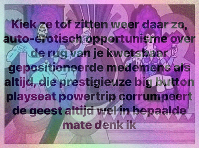 Ben ik op zich wel met hem eens dat laatste maar vind dus eigenlijk sowieso het hele format onzin en een marginalisatie van het artiestenvak bovendien.